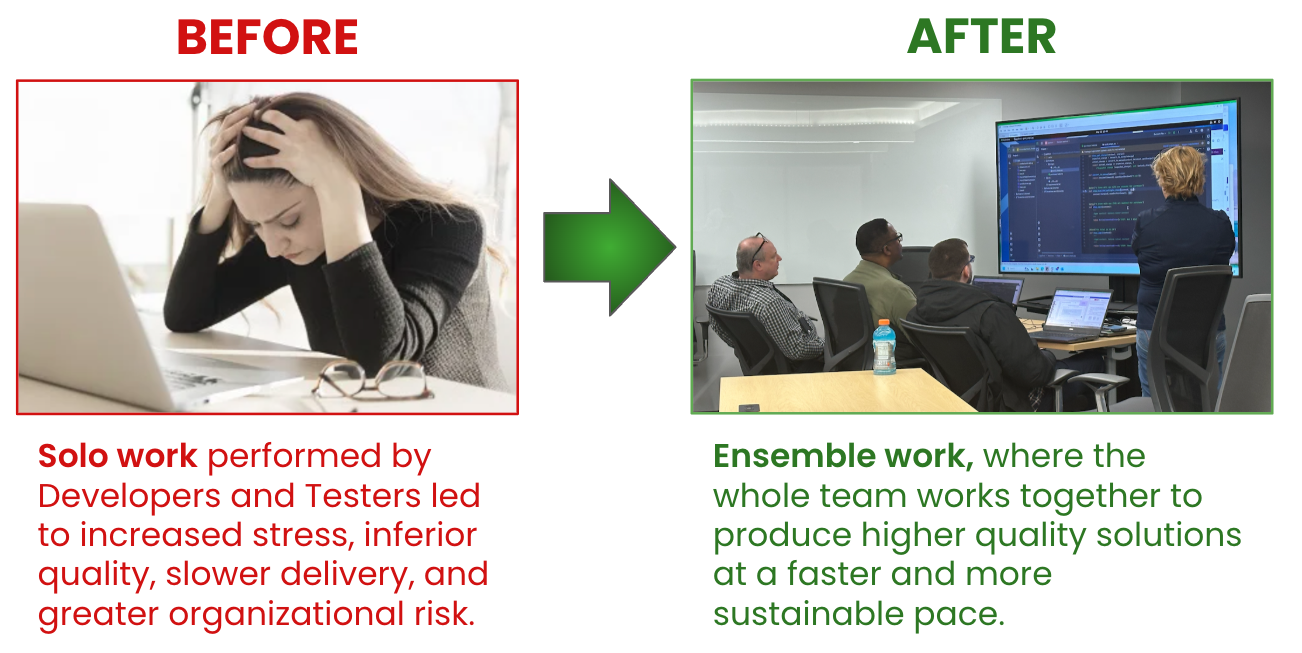 The Industrial Logic coaches guided the team in ensemble programming which fostered collaboration, collective responsibility, improved quality, lower WIP, and decreased cycle time.